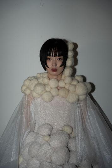 私自身が、ひとりで籠もり守られた空間にとどまっていたいと感じる瞬間から着想を得た。その感覚を、膨張する雲のフォルムとして身体にまとわせている。柔らかな素材や丸みのある立体は安心や包容を象徴する一方で、過剰に身体を覆う構造は外界を遮断する殻としても機能する。
